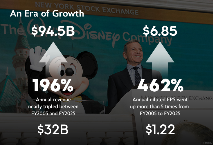 From transformative acquisitions that brought new stories and characters to fuel our businesses, to the expansion of theme parks, a growing fleet of cruise ships, unrivaled creative and commercial success at the box office, and the company’s leadership in streaming, Disney has continued to strengthen its position as a global leader in entertainment. With continued advances in technological innovation, it has expanded the power of its streaming services, positioned ESPN as the ultimate digital destination for sports fans, and driven historic growth across parks and experiences.