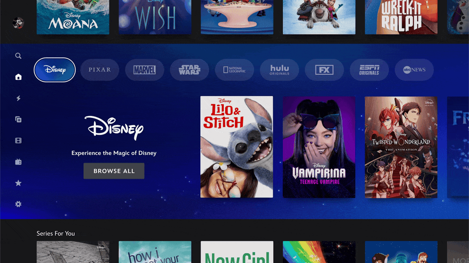 A new navigation bar has been added to the top of the homepage. The “For You” tab is the first screen subscribers will see when they click into Disney+. It’s the new homebase for recommended viewing, powered by an updated algorithm that learns user preferences over time. There are also tabs for Disney+, Hulu, and ESPN, depending on the user’s subscription, making it easier to explore each catalog individually.