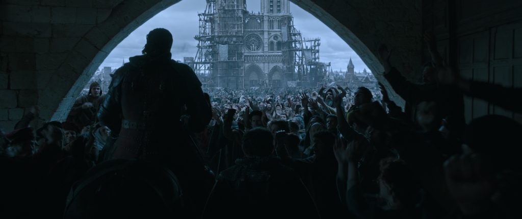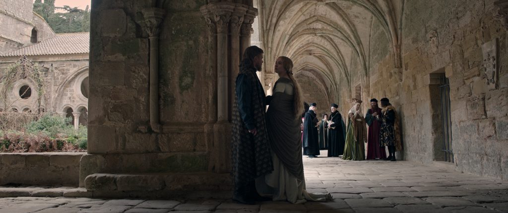 To preserve the period’s authenticity, Max and his team transformed the city’s Place des Cornières into an authentic Middle Ages market with barrels, carts, fish, meat, stallholders, vegetables and wool bags. The set was accentuated with scores of extras dressed as clerics, farmers, merchants, nobles, villagers and more, alongside birds, geese, horses, pigs and sheep. In addition, Château Berzé-le-Châtel, a medieval fortress constructed above an 1,100-year-old Carolingian chapel in Bourgogne, served as portions of the Carrouges Estate.