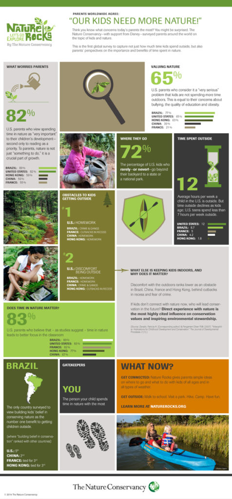 The Nature Conservancy, with support from Disney, recently surveyed parents of children between the ages of three and 18 in the U.S., Brazil, China, France and Hong Kong on the topic of kids and nature. This is the first global survey to capture not only how much time kids spend outside, but also parents’ perspectives on how much importance they place on nature.