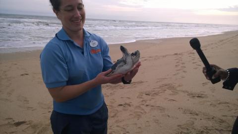 Last week, the turtles that received a clean bill of health and deemed strong enough to brave the ocean once more were taken to Canaveral National Seashore in Titusville, Florida, where Aquarist Tanya Kamerman released each turtle back into the wild. As Tanya approached the water, the smell of salt carried the promise of a nearby ocean in the air and the eager turtles, with flippers flailing in excitement, were taken to the beach. Each one was carried individually into the water to ease their transition back into the ocean. Resistance from the waves threatened to push the turtles back onto shore, so Tanya was careful to carry each one into the water to quickly acclimate with its natural habitat.