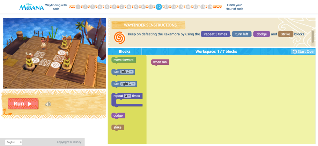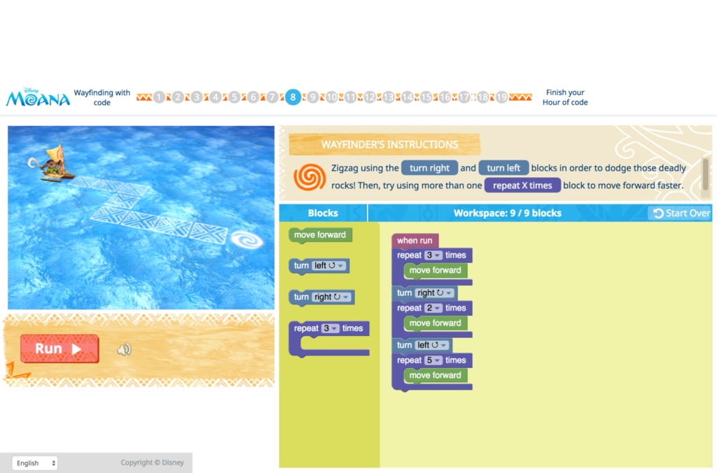 The tutorial follows the film’s lead characters Moana and Maui as they sail through unknown territory across the ocean. As students follow the duo’s travels, they learn basic coding commands that help steer the boat. Along the way, students are introduced to conditionals, sequences and loops while they master the art of navigation. When Moana and Maui are suddenly attacked by the Kakamora—coconut-clad warriors—they must use their coding skills to dodge their pirate projectiles and penetrate their defenses.