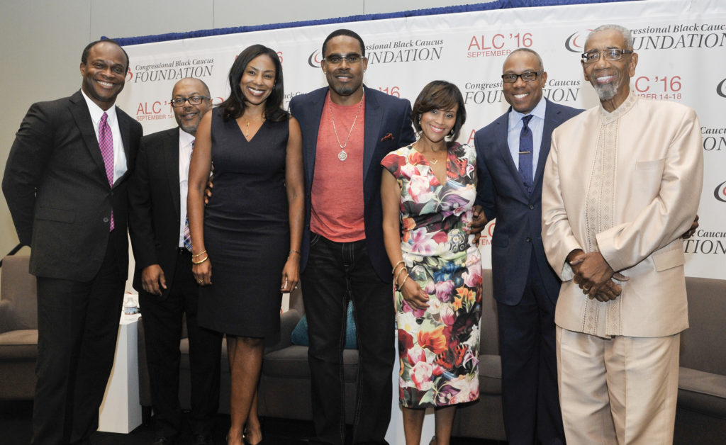 (From L-R: Rob King, Kevin Merida, Jamila Hunter, Lamman Rucker, Ayo Davis, Jay Harris, U.S. Representative Bobby L. Rush [D-Ill.])