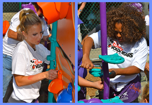 Meanwhile, a team in Los Angeles is bringing to life a new play area that will benefit more than 450 kids at Equitas Charter School. The playground is coming together as more than 200 community volunteers and Disney VoluntEARS roll up their sleeves, dig holes for playground posts, mix and pour cement and screw in the final nuts and bolts.