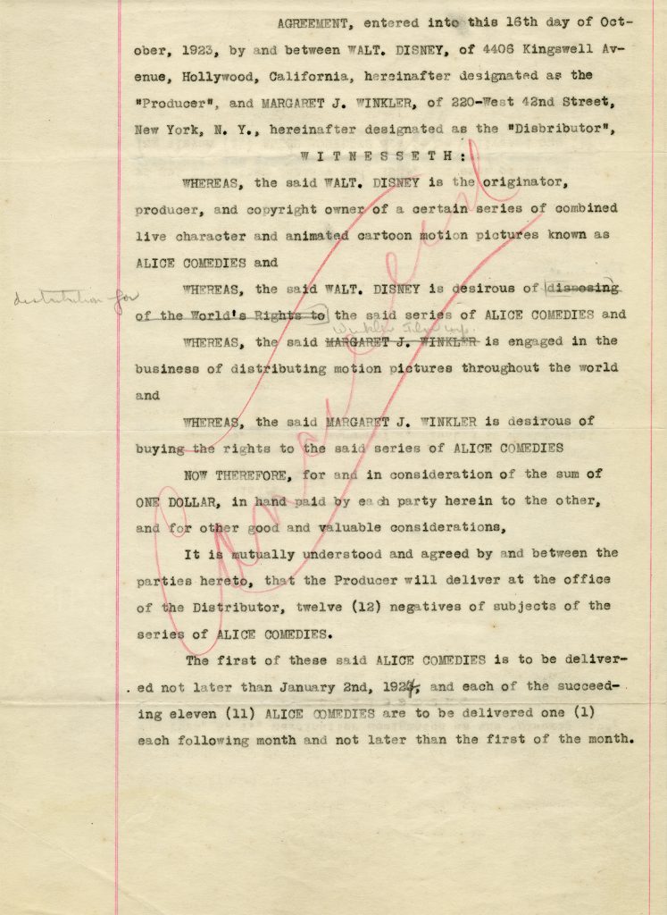 On that date Walt Disney signed a contract with Margaret Winkler—a New York cartoon distributor. The innovative silent cartoons known as the Alice Comedies—which were made between 1924 and 1927 about a real-life girl going on adventures in a cartoon wonderland—was a major success for Walt and Roy and the seed of the Disney company as we know it today.