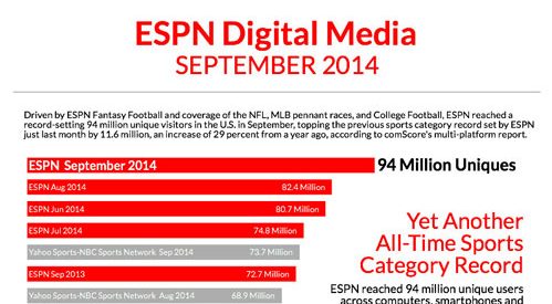 With a seamless, multi-platform experience, ESPN reaches millions of viewers and fans on their mobile devices every day. September marked new digital milestones for the network as it reached a record-setting 94 million unique visitors in the U.S. alone. In looking at last year’s totals, that’s a 29 percent increase.