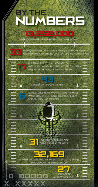Monday Night Football begins its 43rd season tonight – its seventh on ESPN after airing on ABC for 36 years. Fans are counting down the minutes until the Cincinnati Bengals and the Baltimore Ravens kick off at 7:00 p.m. ET followed by the San Diego Chargers versus the Oakland Raiders at 10:15 p.m. ET. To help celebrate football fans’ favorite time of the year, we’re kicking off our first in a series of infographics that will provide a slightly different look at what’s happening around The Walt Disney Company.