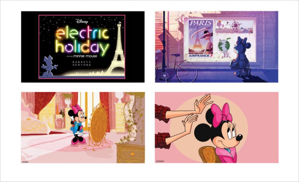 L: “Electric Holiday” will also feature a range of exclusive, limited-edition Disney holiday gifts that is just as magical as the creative itself and includes Vinylmation figures designed by Paul Smith and Diane von Furstenberg, Mickey Mouse ears designed by Rag & Bone and L’Wren Scott, and smaller items such as holiday ornaments, edible sweets, and much more. We also created original and exclusive artwork that will be featured on special Barneys shopping bags available with all in-store and Barneys.com purchases during the holiday season.