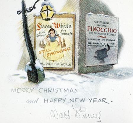 On the last page of the 1938 card, Walt shows his enthusiasm for the success of Snow White — as well as the optimism for Pinocchio, which would be released in 1940.