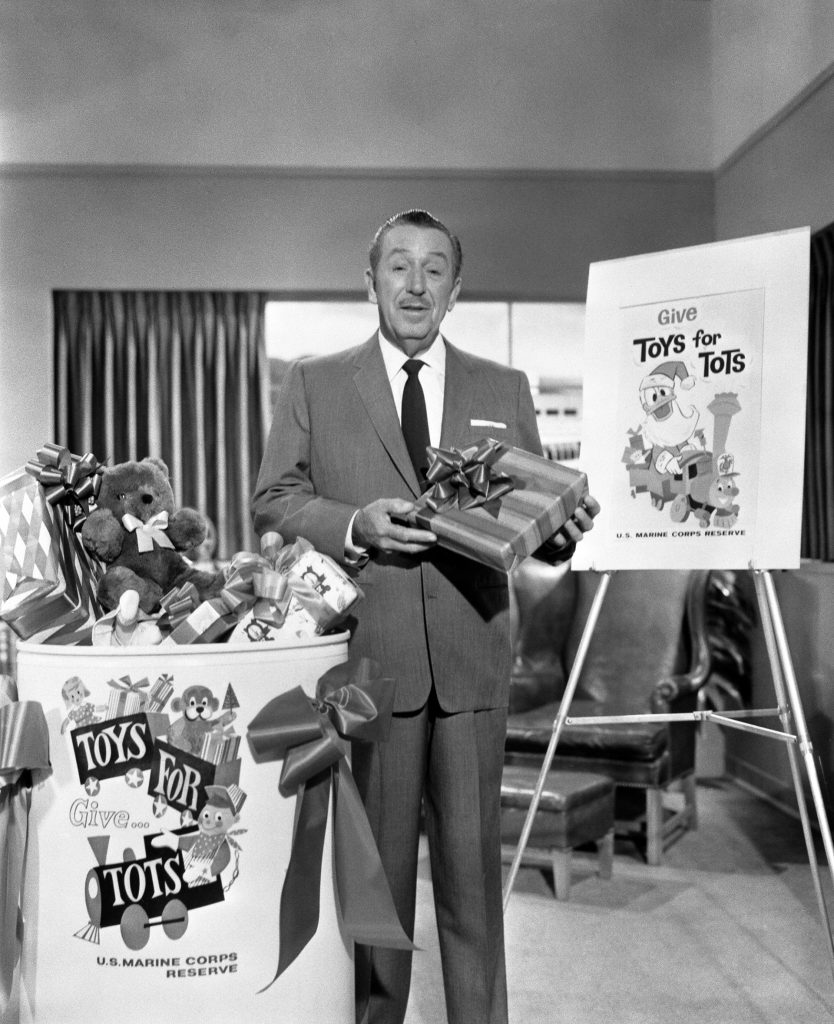 Disney’s relationship with the Marine Toys for Tots Program began in 1947 when Walt Disney and his animators personally designed the original Toys for Tots train logo that is still used today.